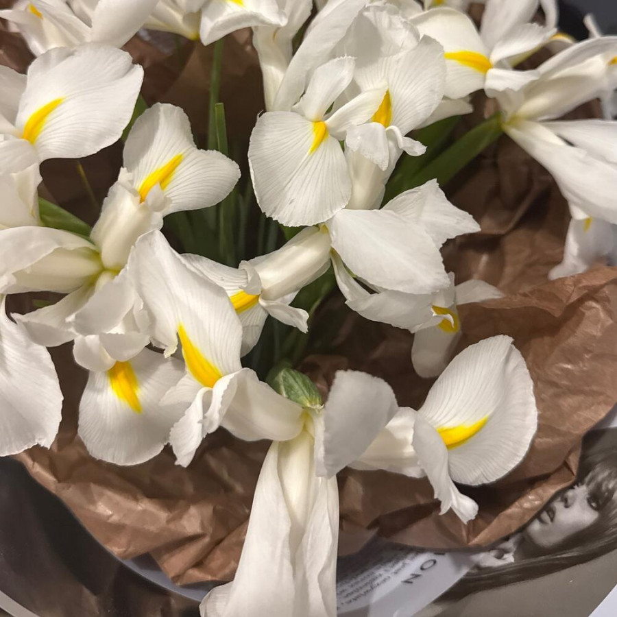 На фото букет из 11 белых ирисов. В составе: ирис 11 шт, дизайнерская упаковка 1 шт, атласная лента 1 шт, . Все цветы свежие и ароматные, букет красиво оформлен и отлично подходит для подарка. Доступна доставка цветов или самовывоз.