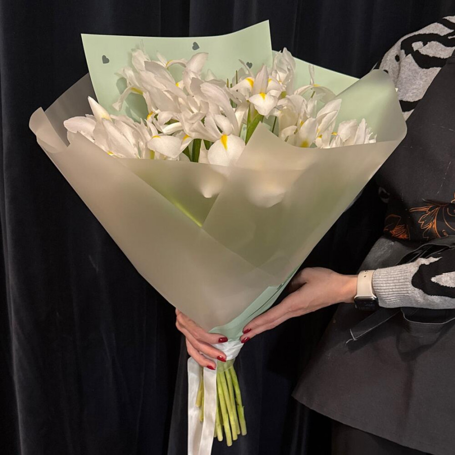 На фото букет из 23 белых ирисов. В составе: ирис 23 шт, атласная лента 1 шт, дизайнерская упаковка 1 шт, . Все цветы свежие и ароматные, букет красиво оформлен и отлично подходит для подарка. Доступна доставка цветов или самовывоз.