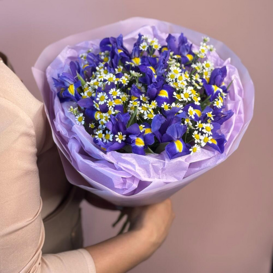На фото букет из ирисов и ромашек. В составе: ирис 11 шт, танацетум 6 шт, дизайнерская упаковка 2 шт, атласная лента 1 шт, . Все цветы свежие и ароматные, букет красиво оформлен и отлично подходит для подарка. Доступна доставка цветов или самовывоз.