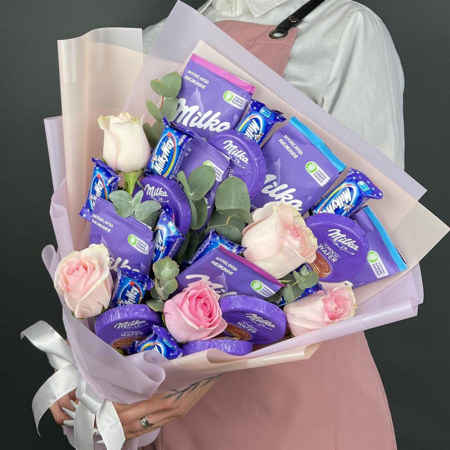 Роза одноголовая - 5 шт. Лента атласная - 1 шт. бумага дизайнерская - 6 шт. конфеты милки вей - 8 шт. конфеты milka плитка - 6 шт. конфеты milka медальки - 5 шт.