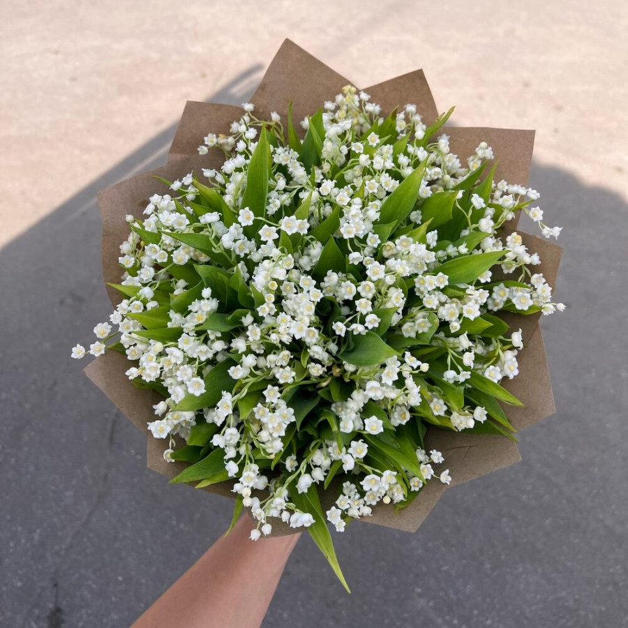На фото букет из ландышей в крафте. В составе: ландыш 21 шт, крафт-бумага 1 шт, атласная лента 1 шт, . Все цветы свежие и ароматные, букет красиво оформлен и отлично подходит для подарка. Доступна доставка цветов или самовывоз.