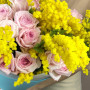 На фото букет из мимозы и розы. В составе: мимоза 10 шт, роза 25 шт, крафт-бумага 1 шт, атласная лента 1 шт, . Все цветы свежие и ароматные, букет красиво оформлен и отлично подходит для подарка. Доступна доставка цветов или самовывоз.