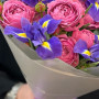 Букет из розовых пионовидных роз и синих ирисов в Назарово