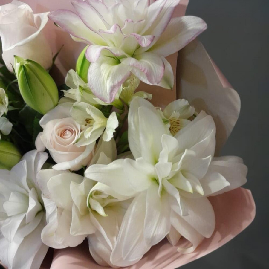 На фото букет «нежность в облаках». В составе: лилия 2 шт, роза 3 шт, альстромерия 2 шт, дизайнерская упаковка 1 шт, атласная лента 1 шт, . Все цветы свежие и ароматные, букет красиво оформлен и отлично подходит для подарка. Доступна доставка цветов или самовывоз.